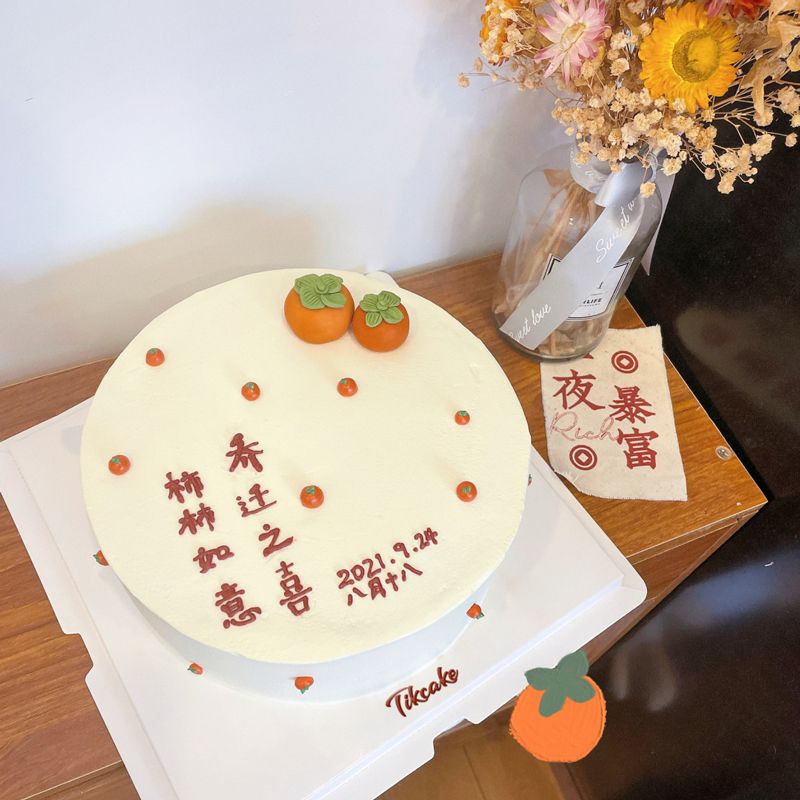 内层蛋糕胚 奶油叠加(含水果果肉),表层翻糖柿子、奶油等装饰(文案可定制,请下单时留言)