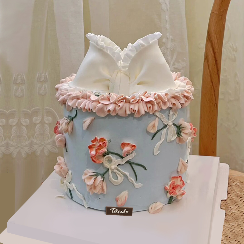 内层蛋糕胚 奶油叠加(含水果果肉),表层白色翻糖蝴蝶结装饰,豆沙裱花装饰。(注:此款含有适量可食用色素,介意者慎拍)