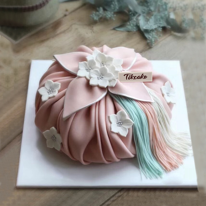 内层蛋糕胚 奶油叠加,表层花瓣福袋主题粉色翻糖皮等装饰